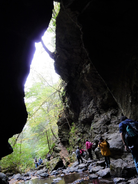 Inside the cave is a 30-foot waterfall fed by Stone Church Brook. The waterfall cascades into a pool at the cavern's entrance. If the water is low enough, we can hop from rock to rock right into the center of the cavern.